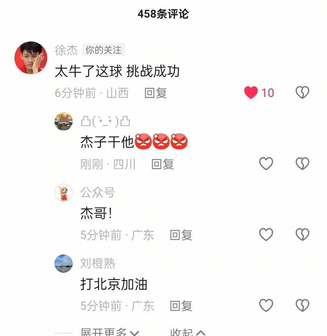徐杰很少会在个人社交媒体公开表达对某位球员或者某支球队,又或者某位吹罚的不满,但广东与山西的比赛确实出现了很多争议判罚。在一个关于徐杰被盖帽的视频的评论区,徐杰罕见真人现身,直接吐槽了这次所谓的“盖帽”:“太牛了这球,挑战成功。”有网友揭示了这个“盖帽”的真相:“原来是可以手插进篮网上来封盖的,涨知识了。”徐杰则评论:“我也涨知识了。”